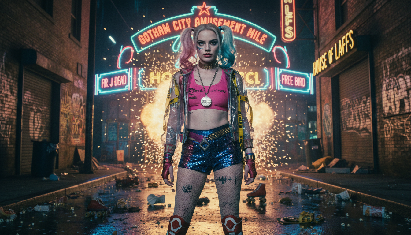 This film‑version of Gotham is vivid, bright, and totally stylized—far from the typical dark and rainy city. Harley’s Gotham is colorful, chaotic, and harshly real . It reflects her own fragmented psyche. She is in control, but her world is unstable—vivid lighting, surreal visuals, and neon tones underline her fractured escape from the Joker’s glow.